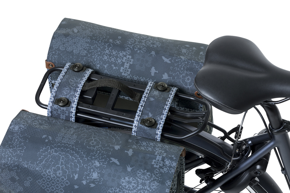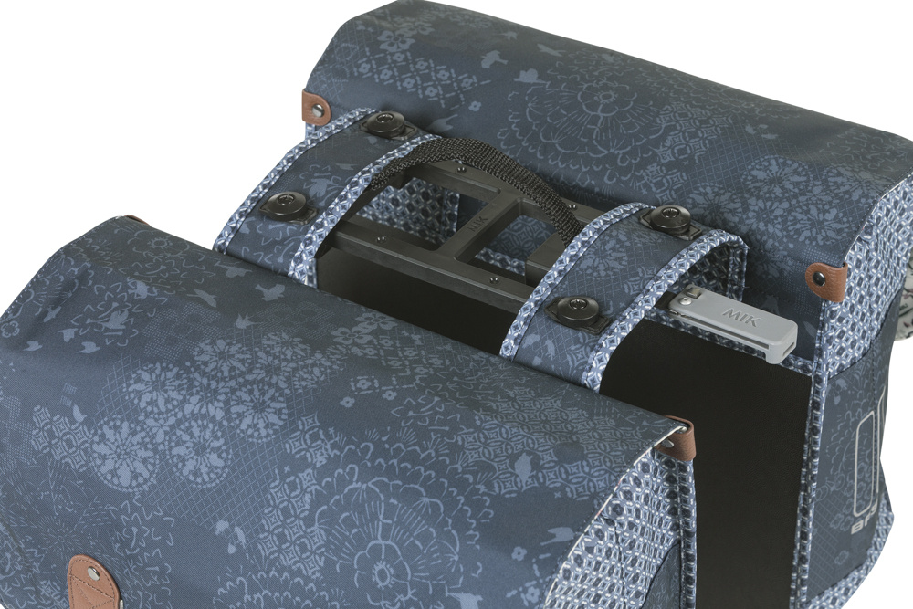 Kurze beschreibung: Die Basil Bohème ist eine doppelte Fahrradtasche mit vormontierter MIK-Adapterplatte. Die fröhlichen blauen Taschen sind für den Gepäckträger eines Damen- oder Herrenfahrrads geeignet.