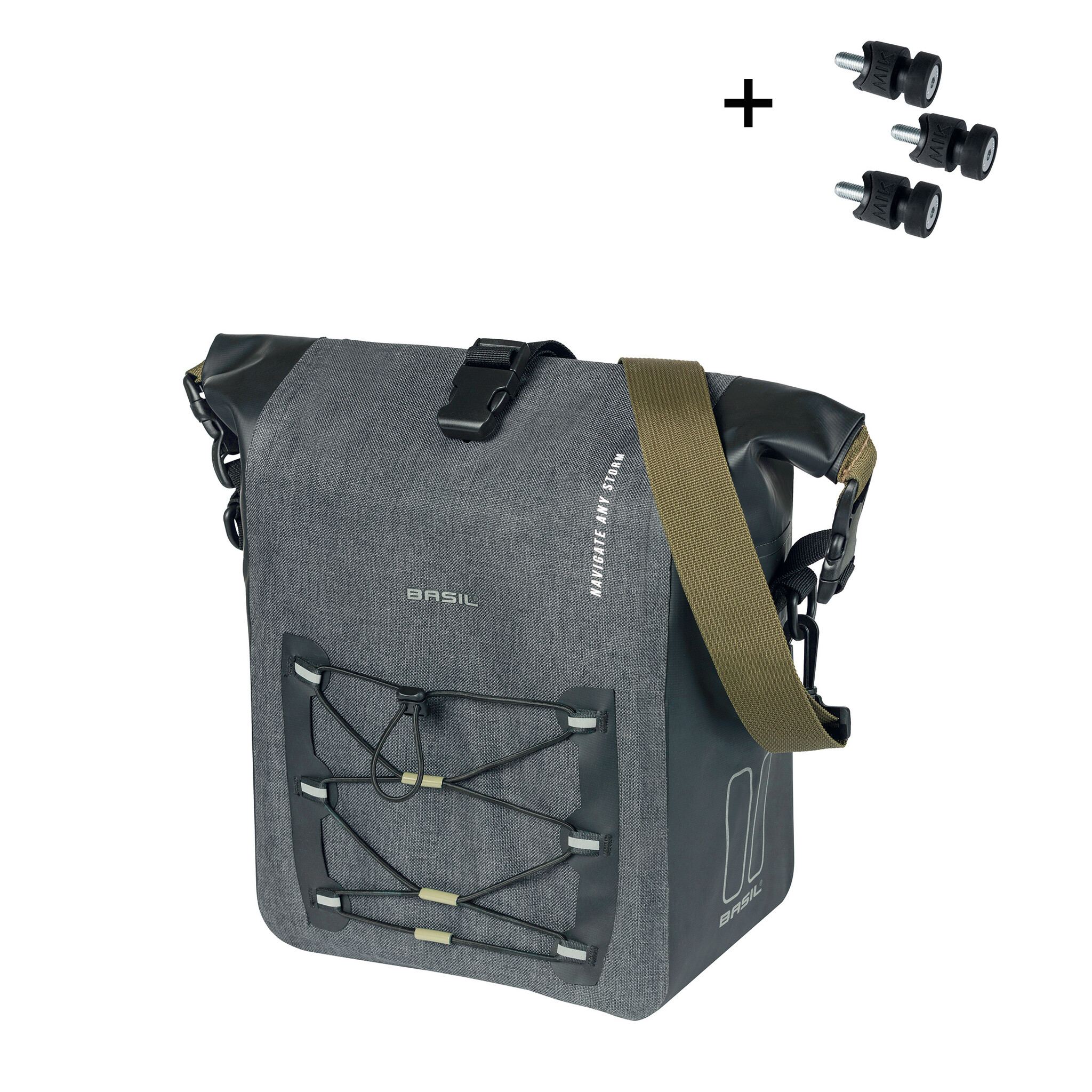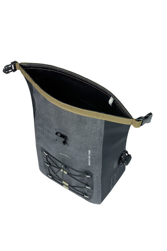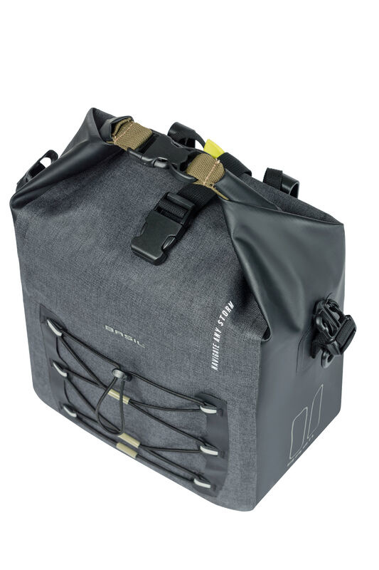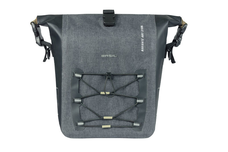 Die Tasche ist aus hochwertigem, wasserdichtem (IPX3) Gewebe gefertigt. Das funktionelle Design sorgt dafür, dass du alles, was du benötigst, in dieser Tasche leicht transportieren kannst. Es wurde an alles gedacht, damit du deine Sachen so praktisch wie möglich überallhin mitnehmen kannst. Dank der verstellbaren elastischen Kordel ist Platz für eine Jacke und mit dem Rolltop-Verschluss lässt sich die Tasche leicht verschließen. Dieser Rolltop-Verschluss kann auf drei unterschiedliche Arten befestigt werden. Gehst du im Dunkeln auf Tour? Kein Problem! Dank der reflektierenden Basil-Logos, welche sich auf drei Seiten befinden, bist du auch im Dunkeln gut sichtbar. So bist du unterwegs immer gut ausgerüstet.