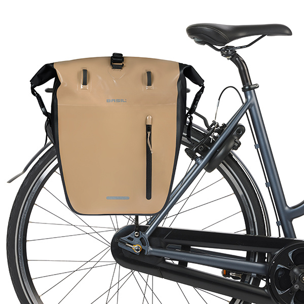 Kurze beschreibung: Die einzelne Basil Rivo L Fahrradtasche in Sand/Schwarz ist eine robuste und wasserdichte Fahrradtasche mit 25–31 Litern Fassungsvermögen und MIK-Hooks. Perfekt geeignet, wenn Sie viel mitnehmen möchten und die Tasche einfach an Ihrem (Elektro-)Fahrrad be