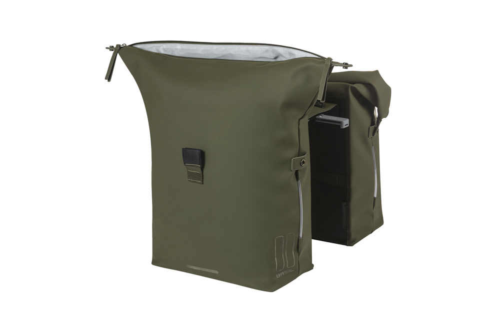 Du suchst eine geräumige Fahrradtasche, die außerdem auch schön aussieht? Dann ist die Basil SoHo Doppelfahrradtasche Nordlicht MIK in der Farbe mossgrün genau das Richtige für dich. Sie ist aus mattem PU-Material, das sich sehr weich anfühlt*, und hat ein Fassungsvermögen von 41 Litern. Die Tasche ist wasserdicht (IPX3), so dass deine Sachen immer trocken bleiben. Du schließt die Tasche mit einem Rolltop-Verschluss, den du mit Druckknöpfen an den Seiten der Tasche befestigst. An deine Sicherheit wurde ebenfalls gedacht. Die Tasche ist nämlich mit Nordlicht Technology** ausgestattet, einem integrierten LED-Streifen. Dadurch fällst du in der Dunkelheit besser auf. Die LED-Beleuchtung funktioniert mit 2 AAA-Batterien (separat erhältlich). Hast du viele und schwerere Sachen in deiner Tasche? Dann kannst du die Tasche mit dem Basil Abstandshalter (separat erhältlich) kombinieren. Dieser Halter verhindert, dass die Tasche in die Speichen deines Fahrrads kommt.
