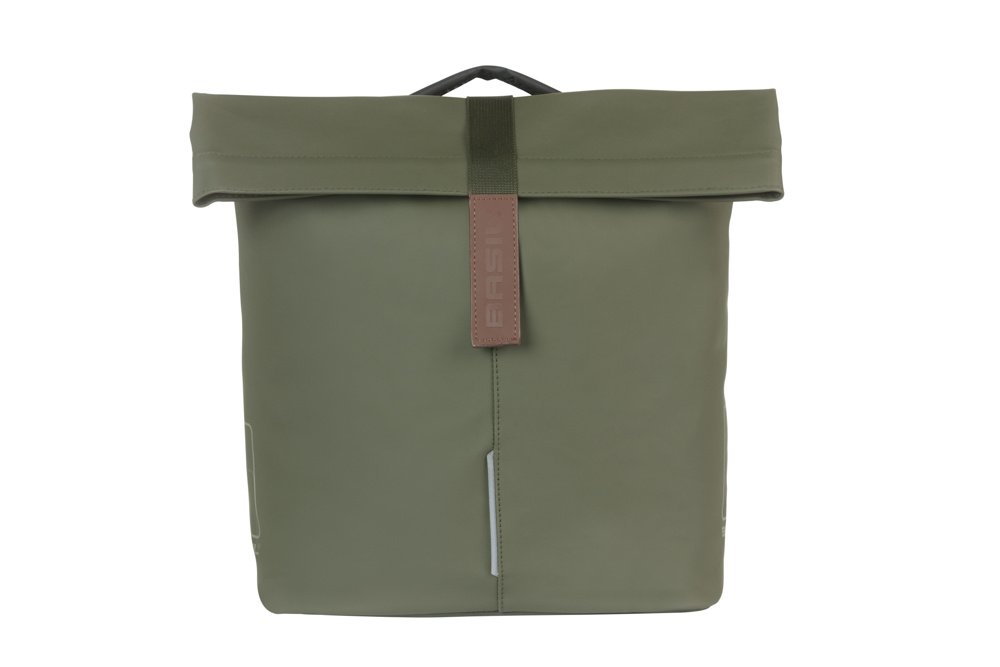 Short description: The Basil City is a fashionable double bicycle bag with plenty of room for your groceries. Available in a beautiful green colour, it`s suitable for mounting on the back of your (electric) bike.