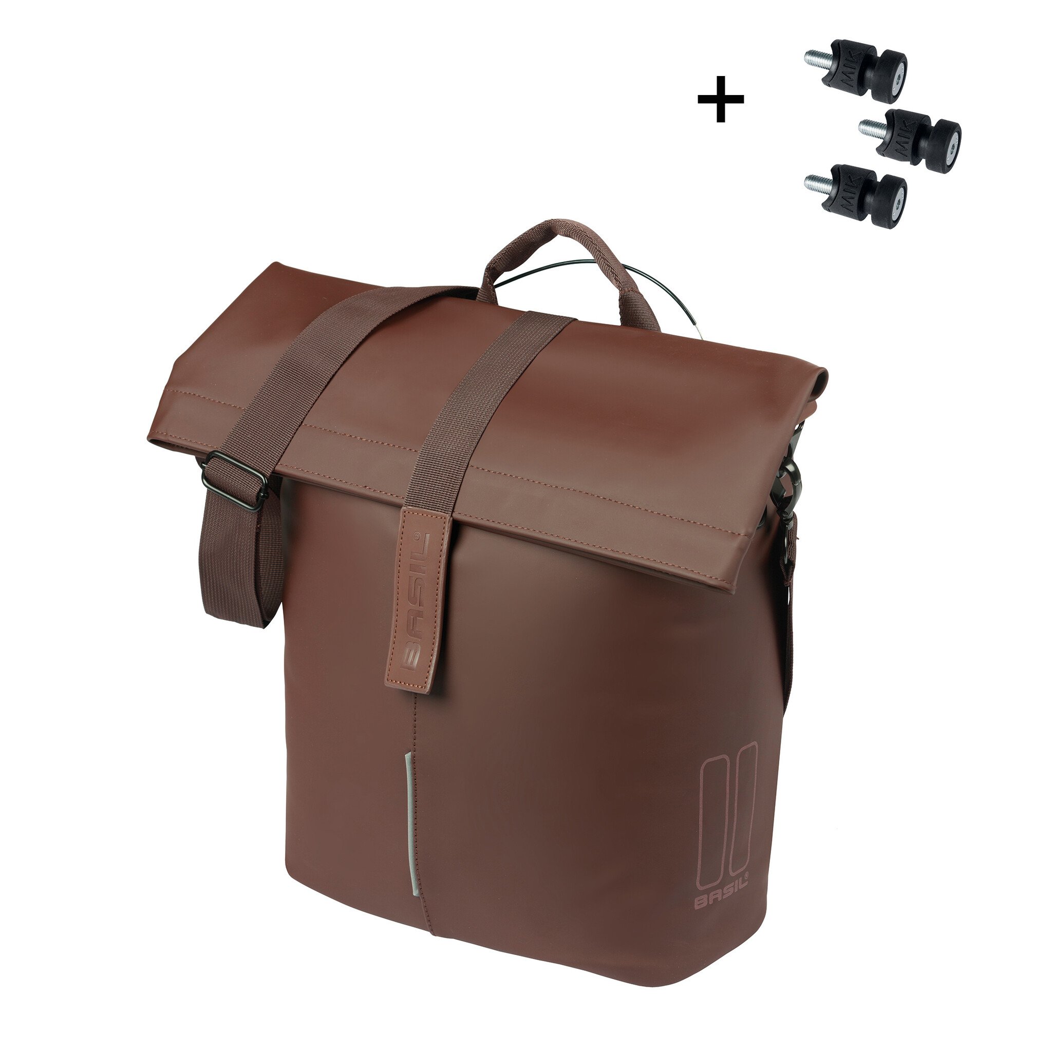 With MIK Studs, you quickly and easily attach and change accessories on your luggage carrier. Thus, with MIK Studs, you not only put a bag or basket on your carrier, but you can also click additional bags on the side of your carrier. This handy system allows you to conveniently get any bag on and off your bike in seconds, stable and without damaging your luggage carrier. What do you need? A bag with MIK Studs and a carrier with three mounting points. If you do not have this carrier, you can still use this handy system using the separately available MIK Frame adapter. For both the top and side, Basil offers beautiful matching bicycle bags.