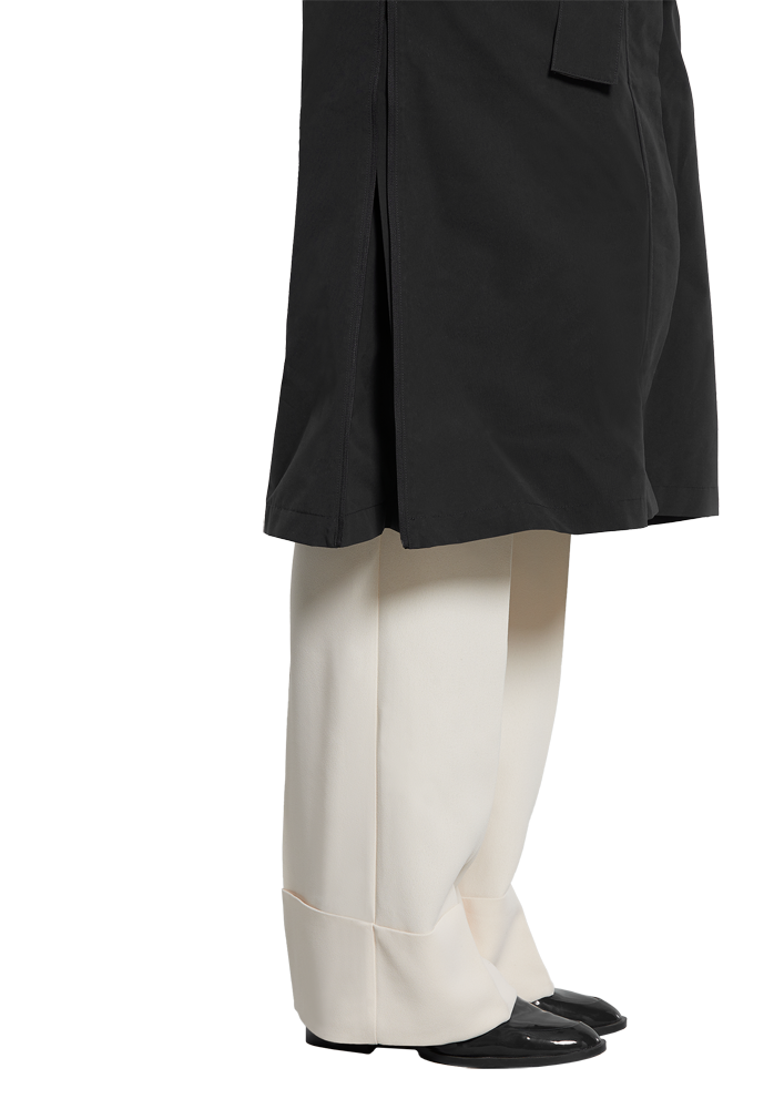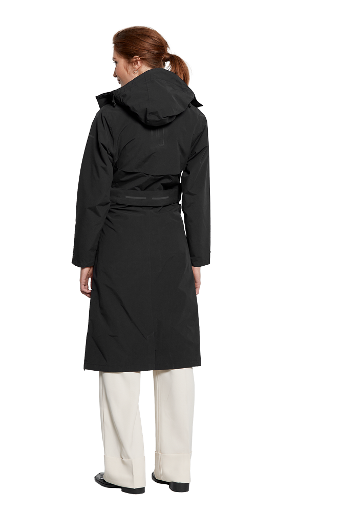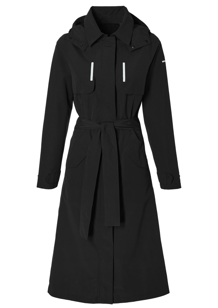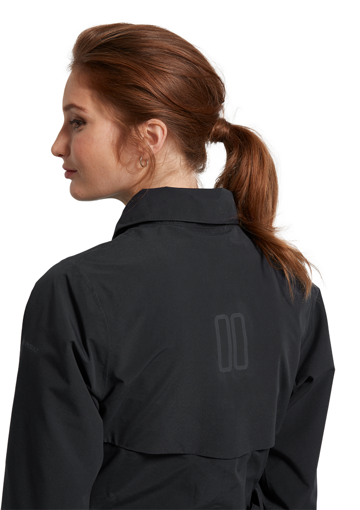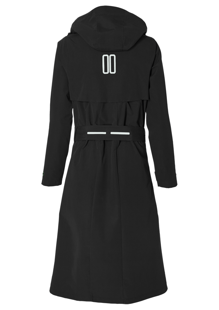 The Basil Mosse is a functional and very stylish cycling raincoat for women. The black jacket is waterproof thanks to 5.000 WP and has a breathability of 5.000 MVP. The DWR coating allows for rainwater to drain off, so perspiration escapes to the outside. At the front of the jacket, there are two zippers: an upper zipper including a chin guard and a lower zipper. These zippers can be used separately from each other. An extra lining behind both zippers keeps your clothes dry. On the sides of the jacket, there are two more zippers. These zippers can be used when cycling with the jacket. You can also broaden the jacket with extra fabric, so you get more freedom of movement. The trench coat also has a mesh and taffeta lining has handy side pockets and is ventilated on both the back and front. The tops of the sleeves are extended and adjustable for a pleasant and comfortable feel. An extra waist elastic on the inside of the jacket contributes to a perfect fit.