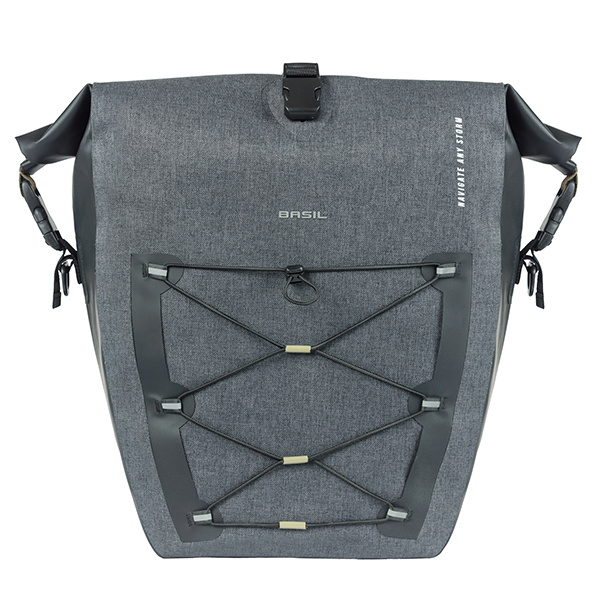 The bag is made of high-quality waterproof (IPX3) fabric. The functional design ensures that this bag can easily carry everything you need. Everything has been thought of to make it possible to take your belongings wherever you go in the most practical way. For example, there is room for a bicycle helmet thanks to the adjustable elastic cord. The bicycle bag can be easily closed with the roll-top closure. This roll-top closure can be attached in three ways. Traveling in the dark? No problem! With the reflective Basil logos on 3 sides, you`ll be visible even then. Hence, you are always prepared for the road.