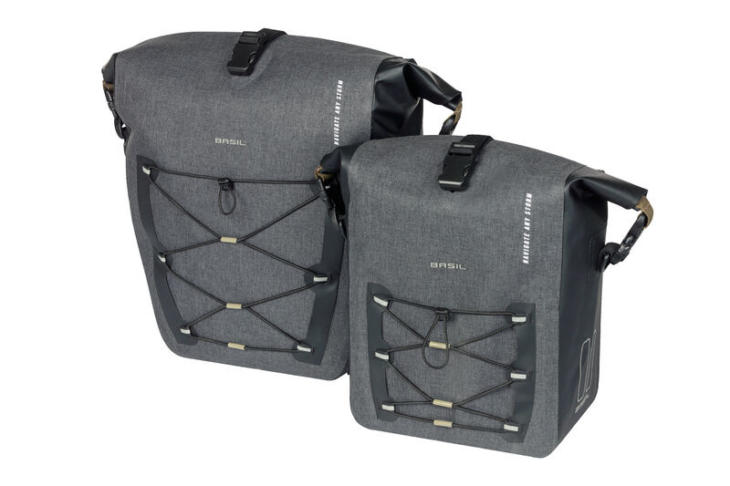 With the Basil Navigator Storm MIK Studs bicycle bag in size L, you choose a sporty and functional single bicycle bag. With this bag, you can embark on any adventure. 100% waterproof The bag is made of high-quality waterproof (IPX3) fabric. The functional design ensures that this bag can easily carry everything you need. Everything has been thought of to take your belongings wherever you go as practically as possible. Thanks to the adjustable elastic cord, there is room for a bike helmet, and the bag can be easily closed with the roll-top closure. This roll-top closure can be attached in three ways. Traveling in the dark? No problem! With the reflective Basil logos on 3 sides, you will be visible. You will always be prepared. MIK Studs With MIK, you quickly and easily attach and change accessories on your carrier. Thus, with MIK Studs , you not only put a bag or basket on your carrier, but you can also click additional bags on the side of your carrier. This handy system allows you to conveniently get any bag on and off your bike in seconds. Stable and without damaging your carrier. What do you need? A bag with MIK Studs and a carrier with three mounting points. If you do not have this carrier, you can still use this handy system using the separately available MIK Frame adapter. For both the top and side, Basil offers beautiful matching bicycle bags. Features: Easy to attach to any bike, including E-bikes, thanks to MIK Studs. Compact yet with plenty of storage space. Waterproof (IPX3) Capacity: 25-31 liters Dimensions: 46 x 36 x 21 cm (Exterior dimensions) Mounting: on the carrier Material: Tarpaulin / Melee Polyester Color: Black
