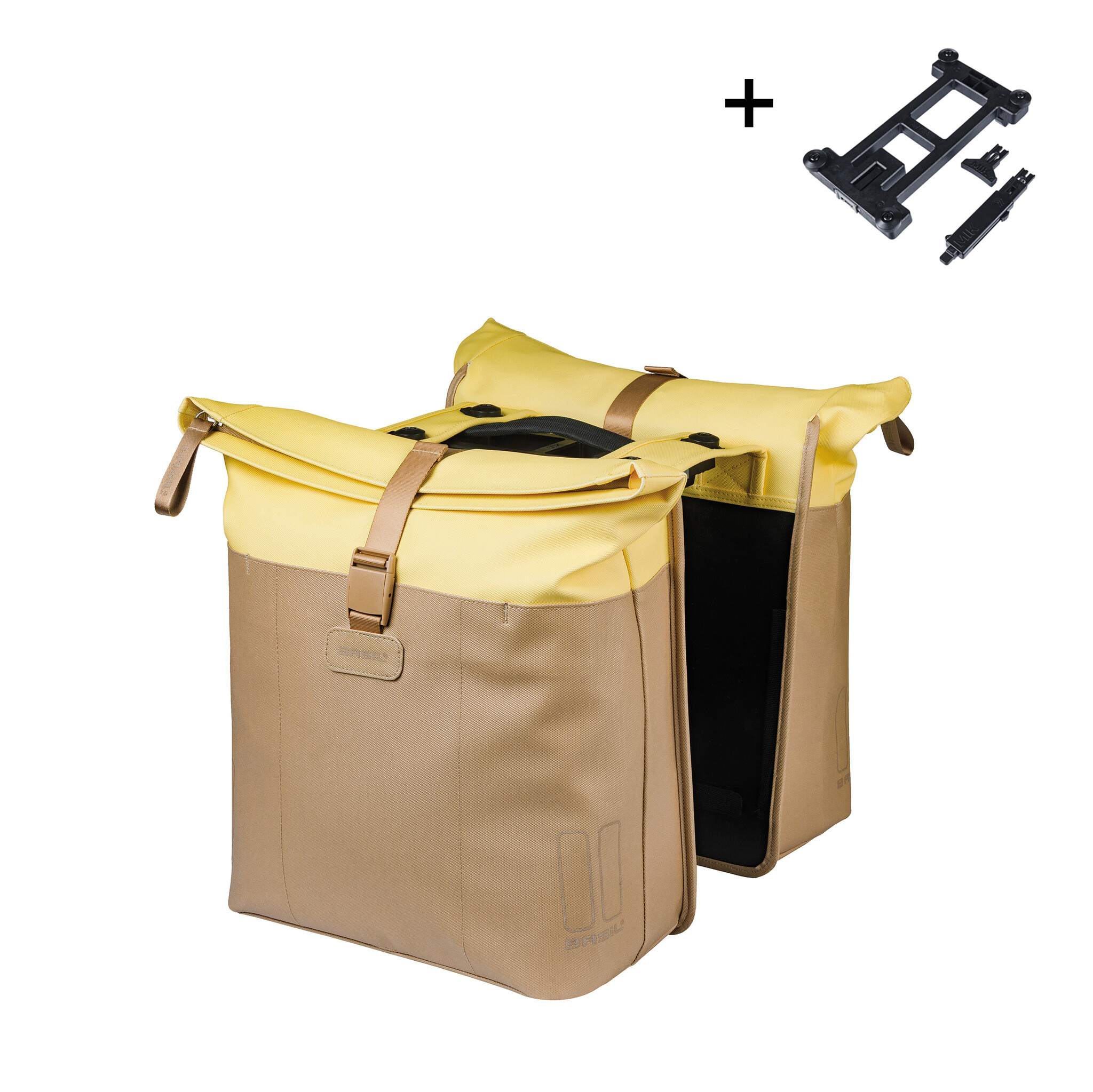 Short description: The Basil Vive double pannier bag in sand/yellow is a spacious and stylish double pannier with a capacity of 28–35 litres, perfect for daily use. With the MIK system, you can easily attach the bag to the back of your (electric) bike!