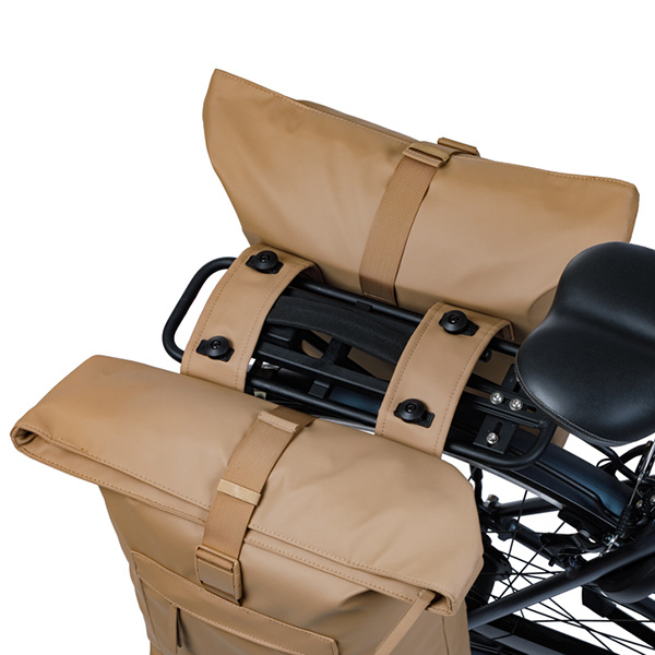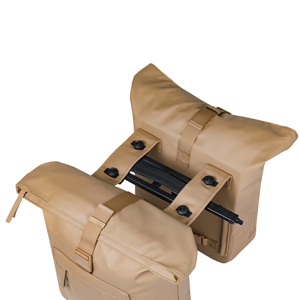 Korte omschrijving: De Basil Brooklyn dubbele fietstas in sand is een ruime en moderne dubbele fietstas van 41 liter, perfect voor woon-werkverkeer. Met het MIK-systeem klik je de tas zo achterop je (elektrische) fiets!