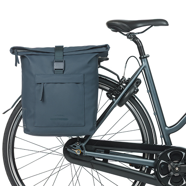 De dubbele fietstas is voorzien van het Basil Universal Bridge System waardoor die op alle bagagedragers past (ook e-bikes) en gecombineerd kan worden met bevestigingssystemen als Racktime en i-Rack/Carrymore.