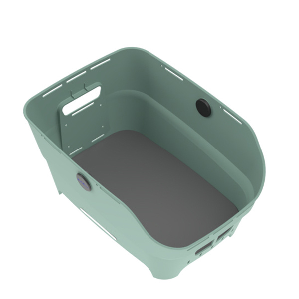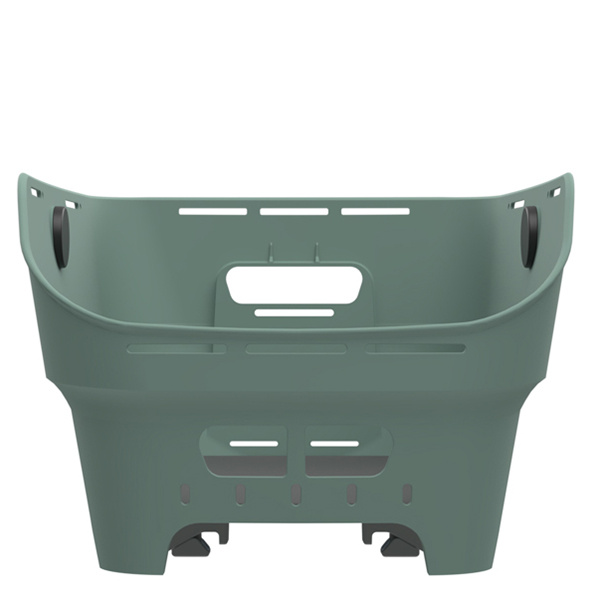 De mand heeft een afgeronde rechthoekige vorm en biedt veel gebruikscomfort. De afgeschuinde zijde aan de zadelkant zorgt voor extra trapvrijheid tijdens het fietsen. Een geïntegreerde anti-slipmat houdt je spullen stabiel, ook op hobbelige wegen. Het handvat is voorzien van demping, waardoor je de mand stil en comfortabel draagt zonder gerammel. Met 21 liter inhoud is er voldoende ruimte voor een rugzak of laptoptas. De openingen in de bodem zorgen voor regenwaterafvoer.