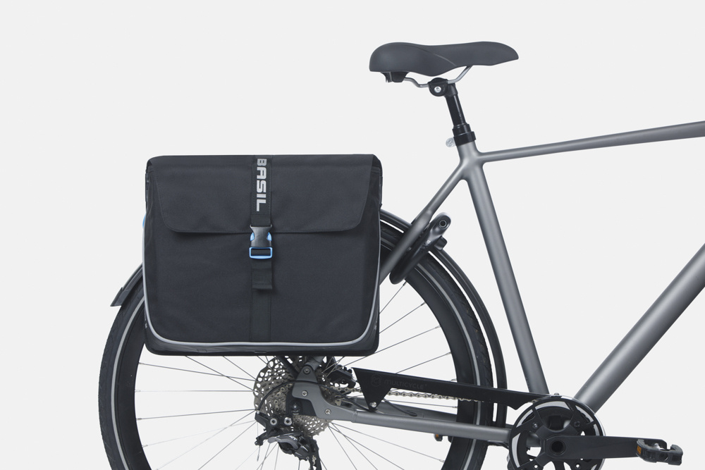 De Basil Forte Double bag is een praktische dubbele fietstas waar je veel boodschappen in mee kunt nemen. Handig voor als je na je werk nog even snel de boodschappen voor de avond wilt halen. De tas is gemaakt van waterafstotend polyester in combinatie met tarpaulin. Daarbij heeft de tas een extra stevige constructie. Een echte krachtpatser dus! De Forte Double bag is voorzien van een aansnoerband en verstelbare sluiting. Dankzij de reflectie op alle zijden én een extra lange reflective piping, ben je beter zichtbaar in het donker.